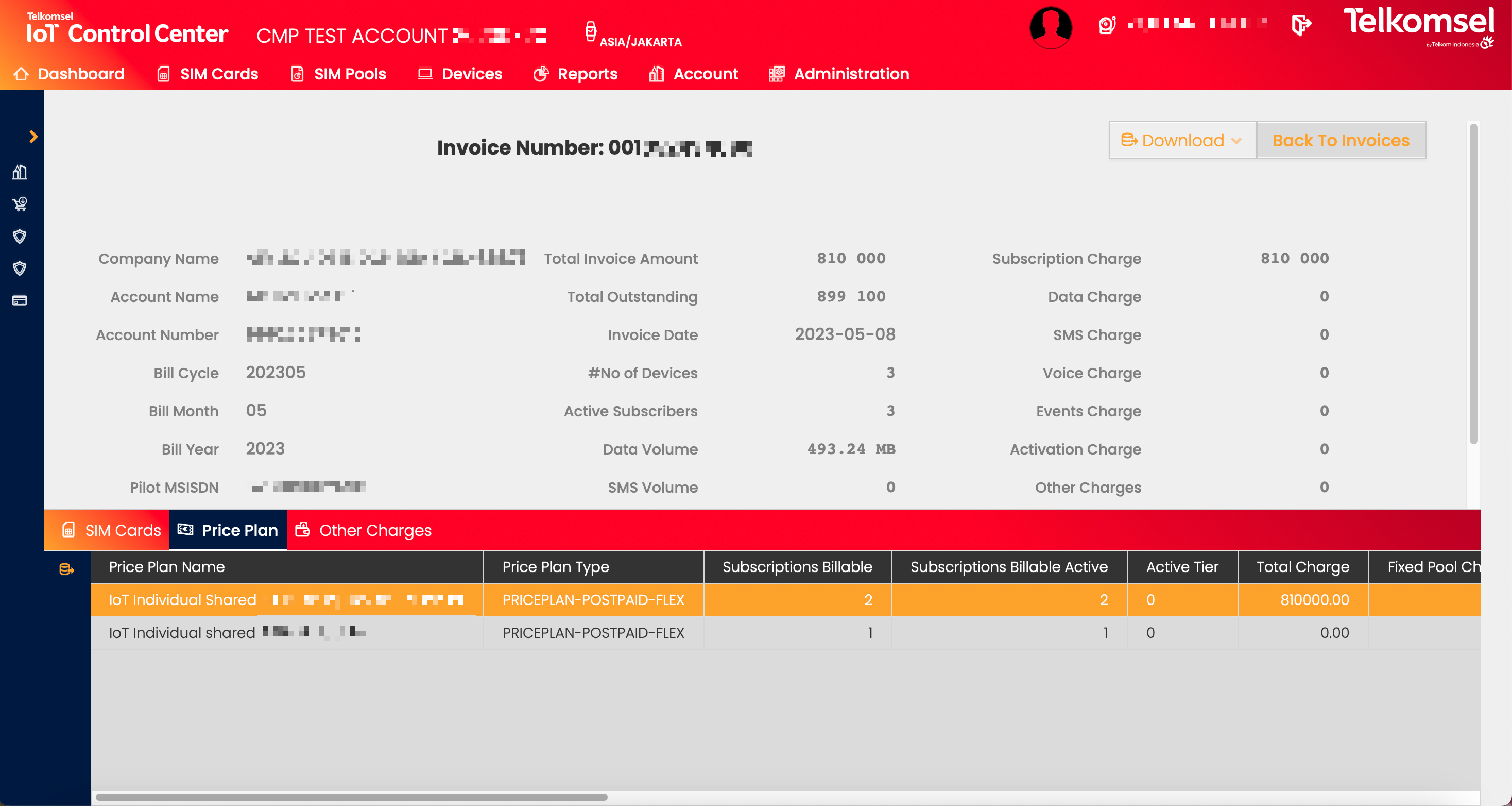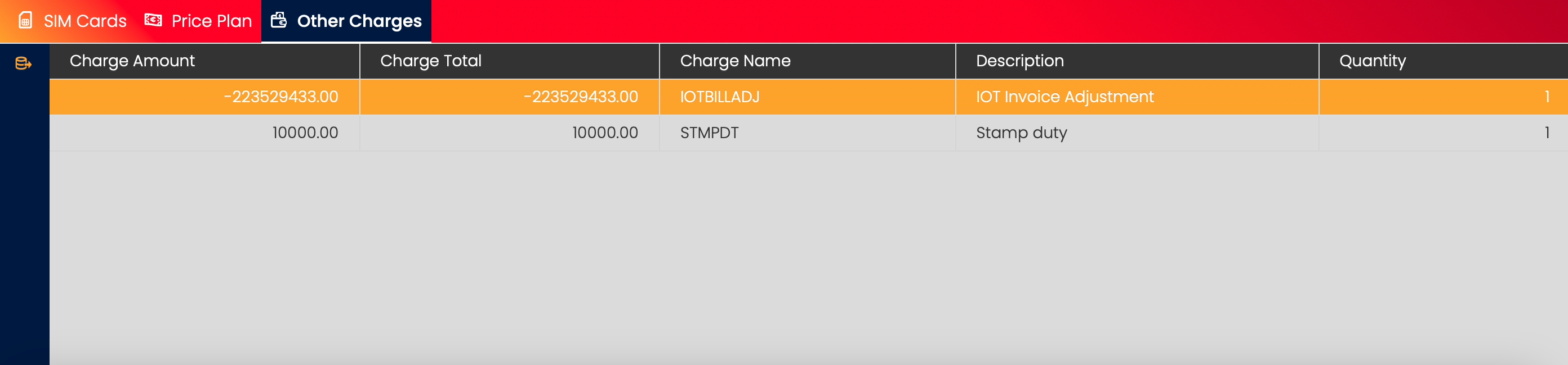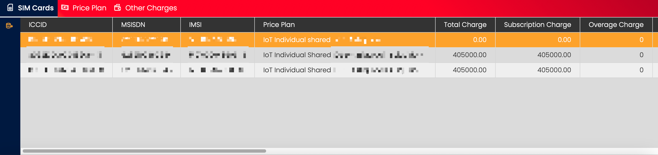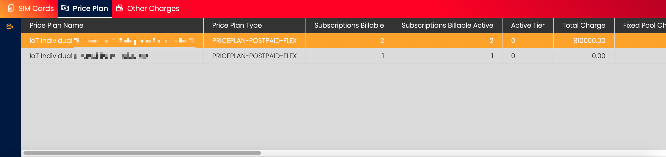 The Price Plan tab shows all the Price Plans with billable SIM Cards during the Billing Cycle.