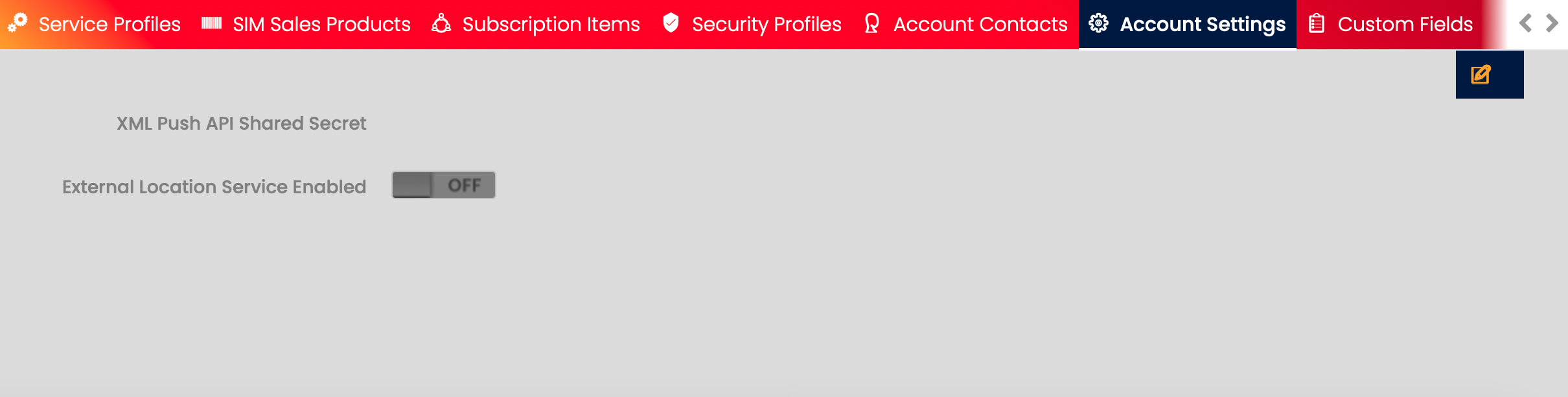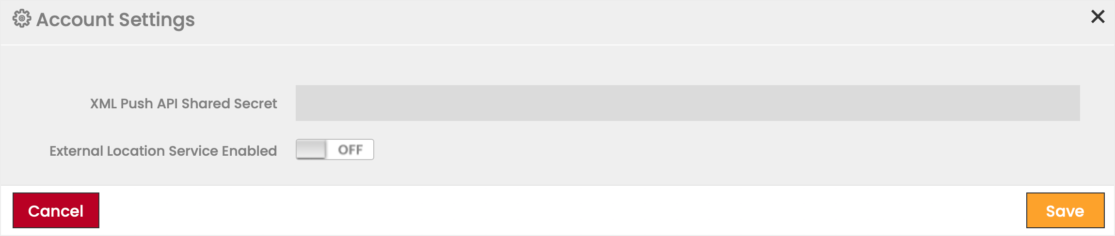 Account Settings allows Account Users to define or modify the XML Push API Shared Secret of the Account and whether External Location Service is enabled for the Account.