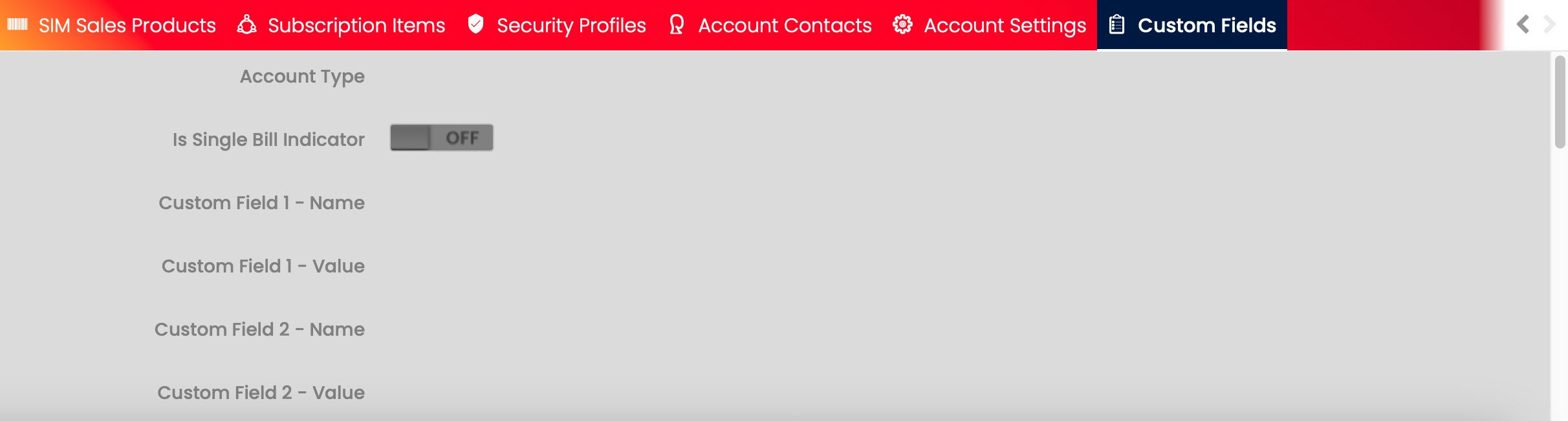 The Custom Fields tab shows Custom Attribute values on the CSP Context for the Account. The values are available in read-only mode.