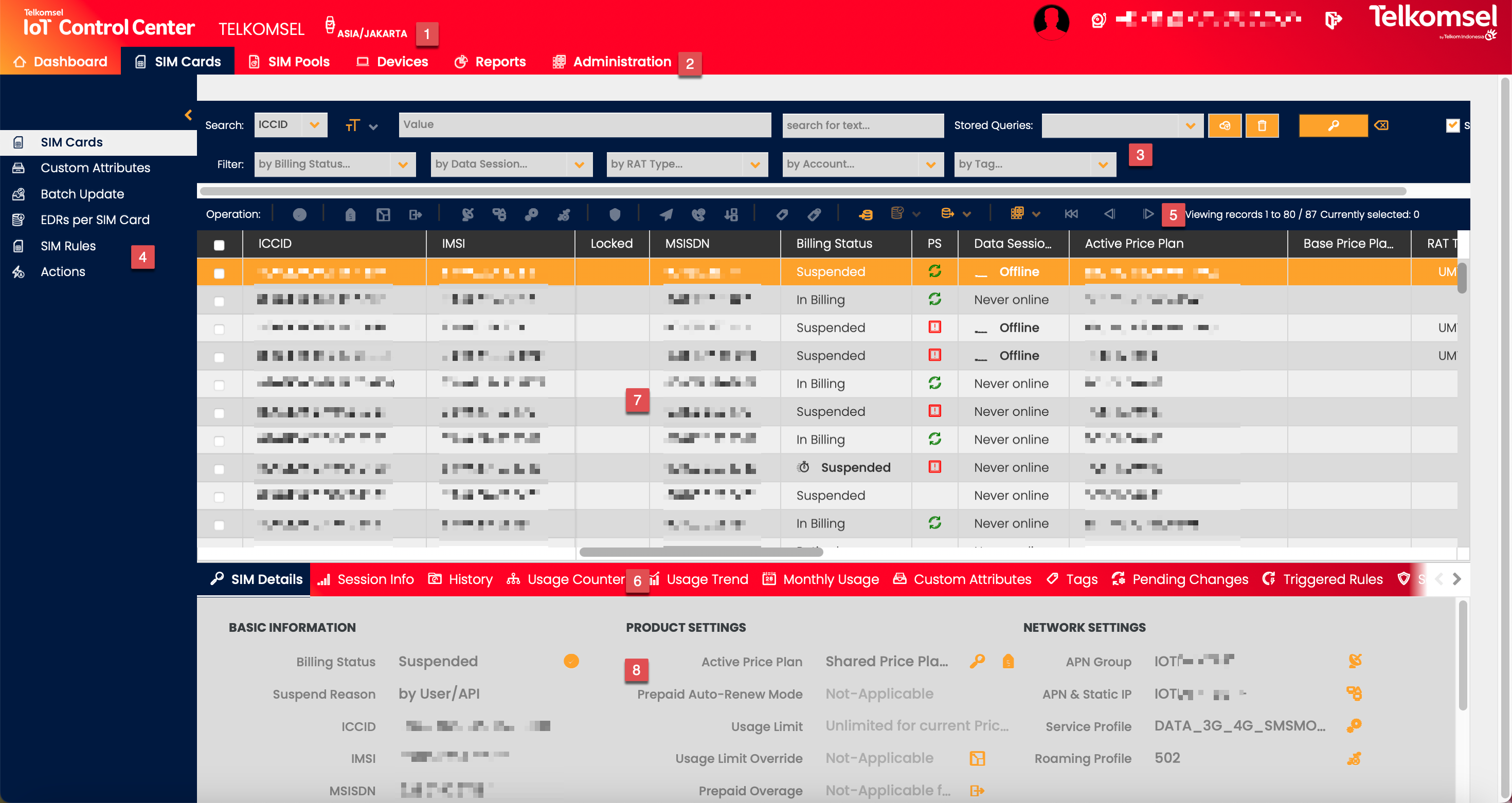 The Object Grid(7) is the list of Objects such as SIM Cards, Devices, or Accounts.