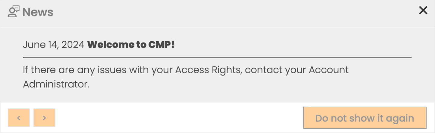 Upon login, all newly created News postings are presented to the User as a pop-up message. The User can scroll through multiple messages with the arrow buttons, and by clicking the Do not show it again button the News posting won't be shown again.