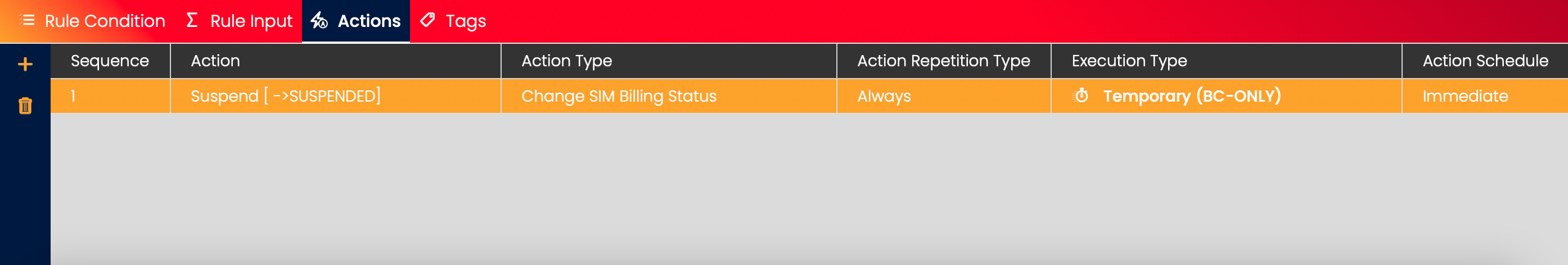 For conditions based on SIM Card properties (Session Status, MSISDN Change, etc.), the Rule Condition panel will not be populated with any data.