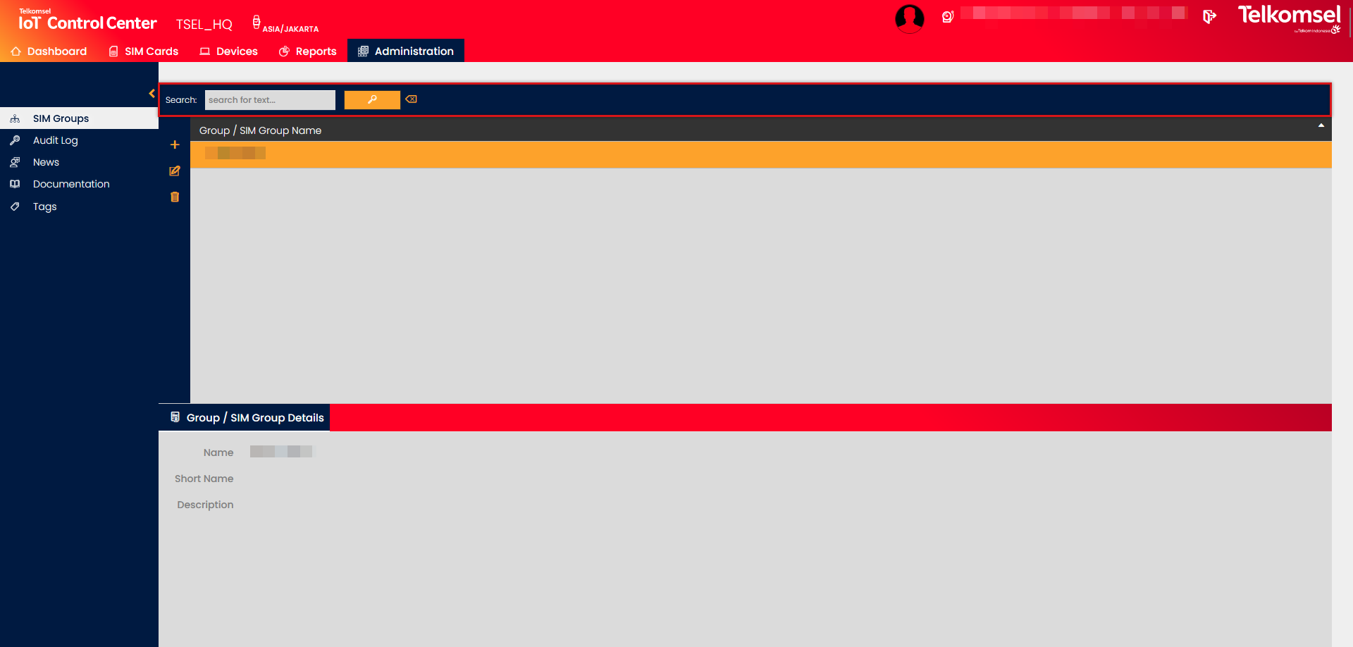The search option of the SIM Groups module allows Users to retrieve a list of SIM Groups by entering text into the Search field.